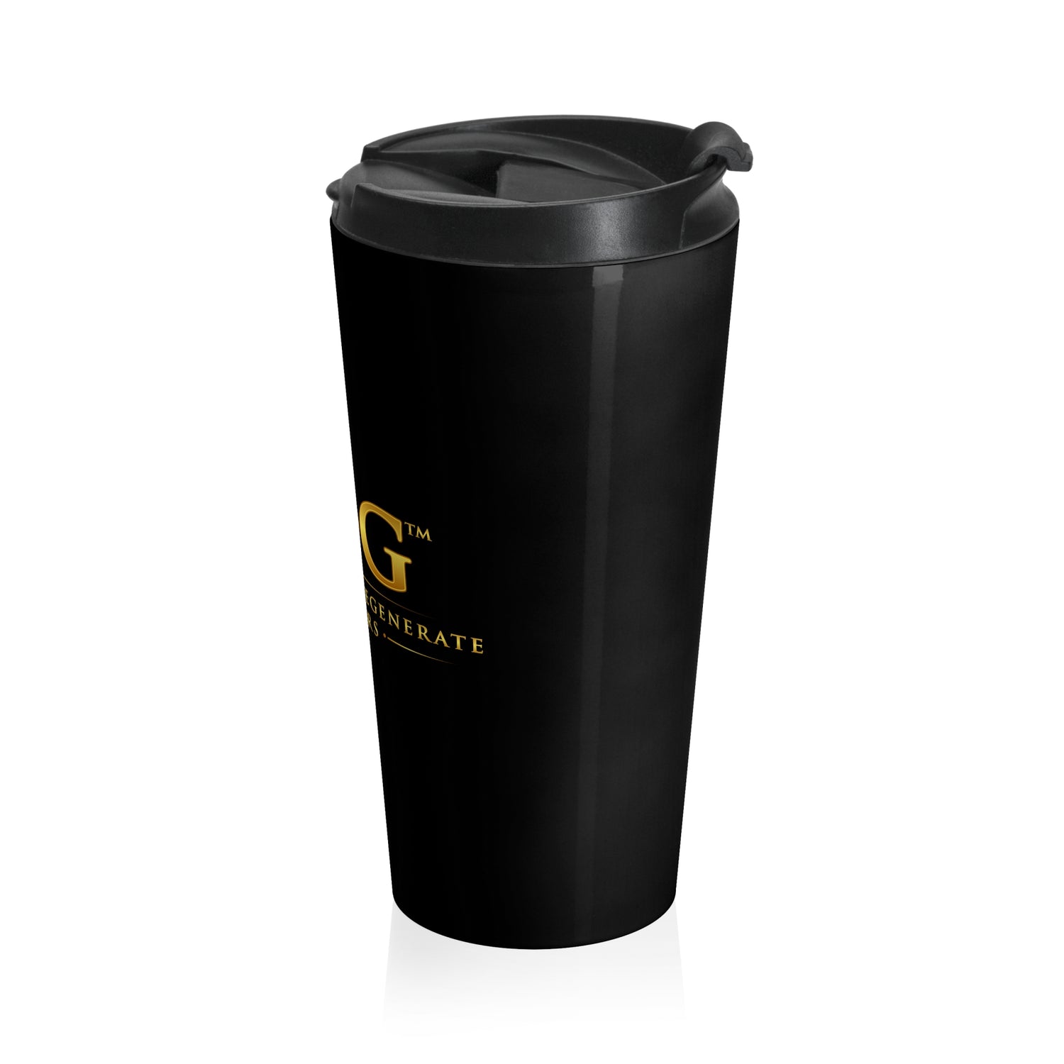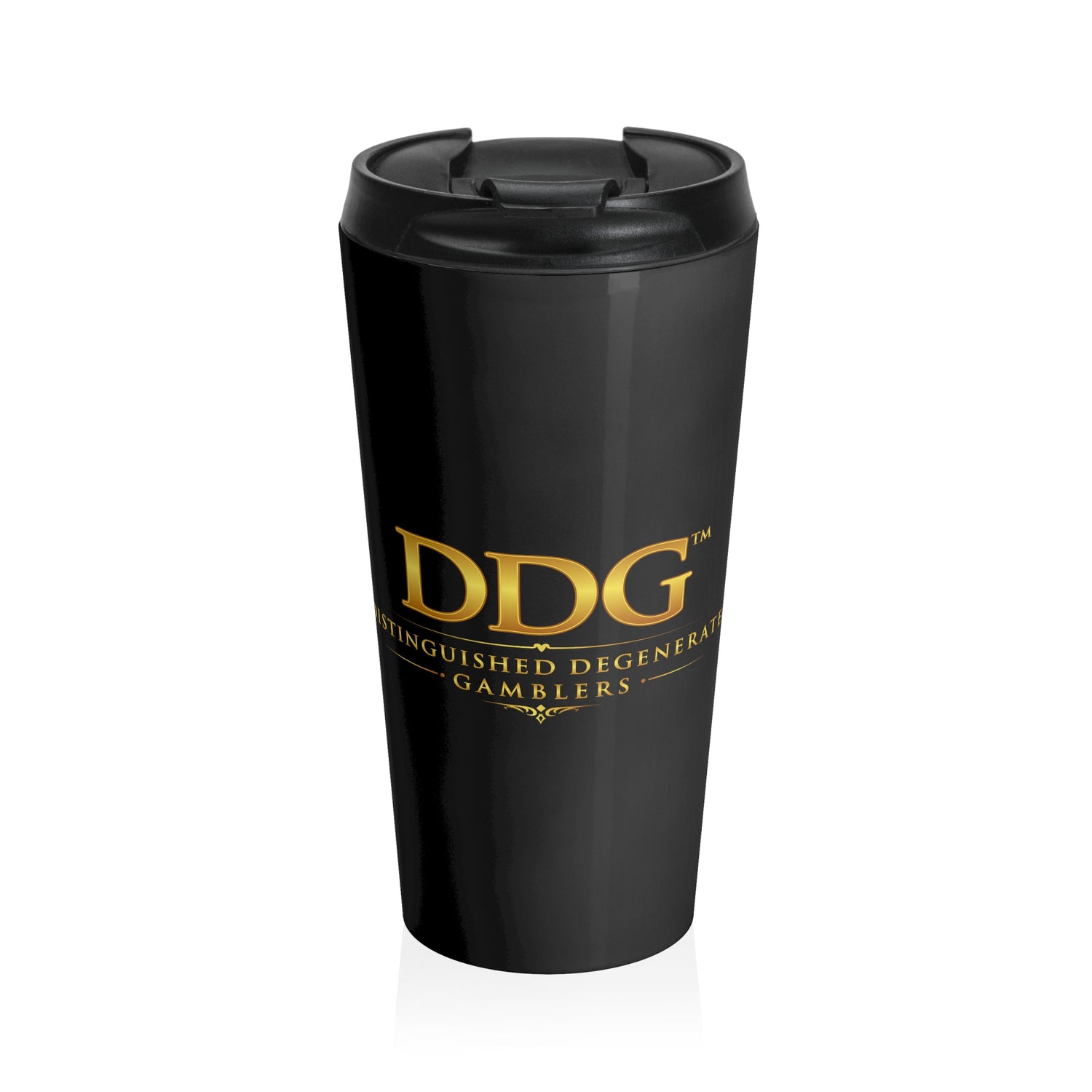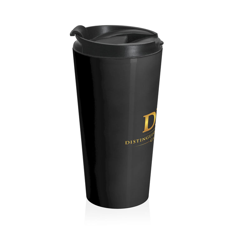 This sleek 15oz stainless steel travel mug carries a quiet confidence — glossy black, vacuum-insulated, and built to travel with you. It keeps drinks at the right temperature while resisting rust and stains. The screw-on BPA-free lid has a flip-top for easy sips and a secure, leak-resistant seal that sits flush with the mug’s rounded silhouette. The subtle gold logo on the black finish reads like a small nod to bold, playful taste. It slips into most car cup holders and feels substantial in hand, a daily companion for those who move fast but savor slow moments with their coffee or tea.
