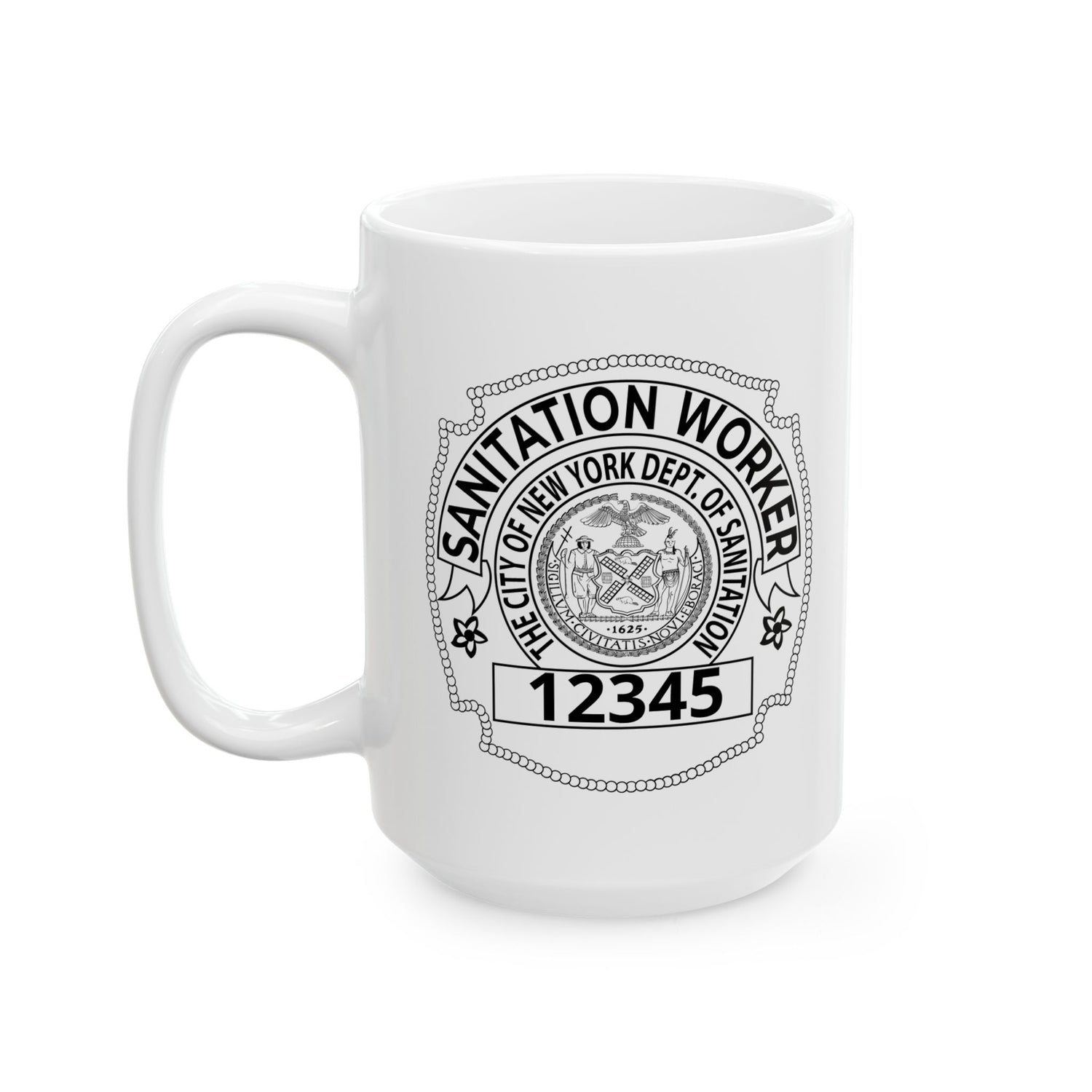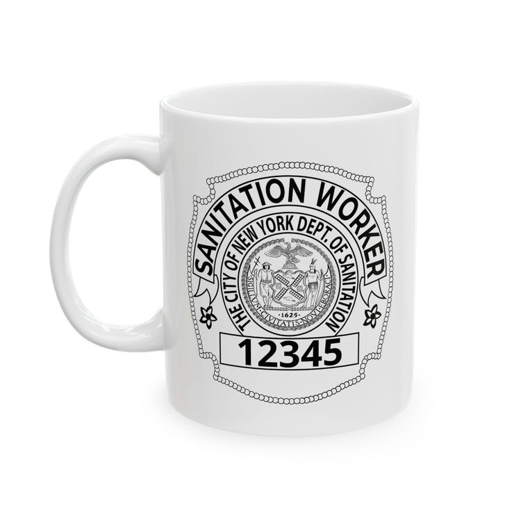 This glossy ceramic mug honors NYC sanitation workers with a personalized badge-style design. When you lift it, you feel the steady rhythm of early morning routes and the quiet pride that comes with a job well done. Bold badge number and name sit crisp against the white ceramic, like identification on a uniform. It’s the kind of mug that fits into a locker, a break-room table, or a kitchen shelf — a small daily reminder of duty, grit, and community. Hand it to someone who sweeps sidewalks before sunrise, who knows the city by its smell and sound, and watch them fold a private smile into the first sip. Whether it’s for a post-shift coffee or a slow weekend cup, the design speaks in straightforward, respectful tones that resonate with those who wear the title and those who respect it.
