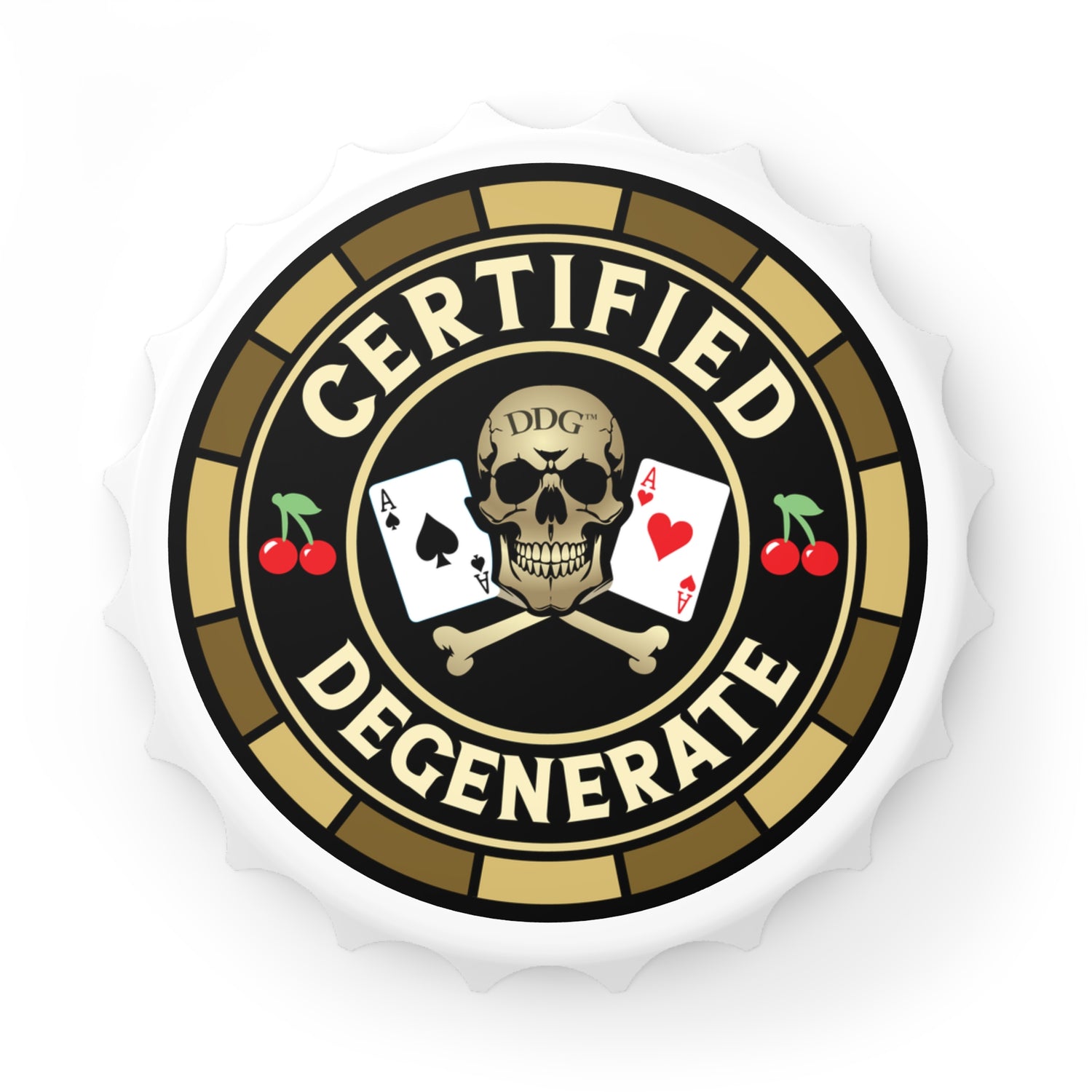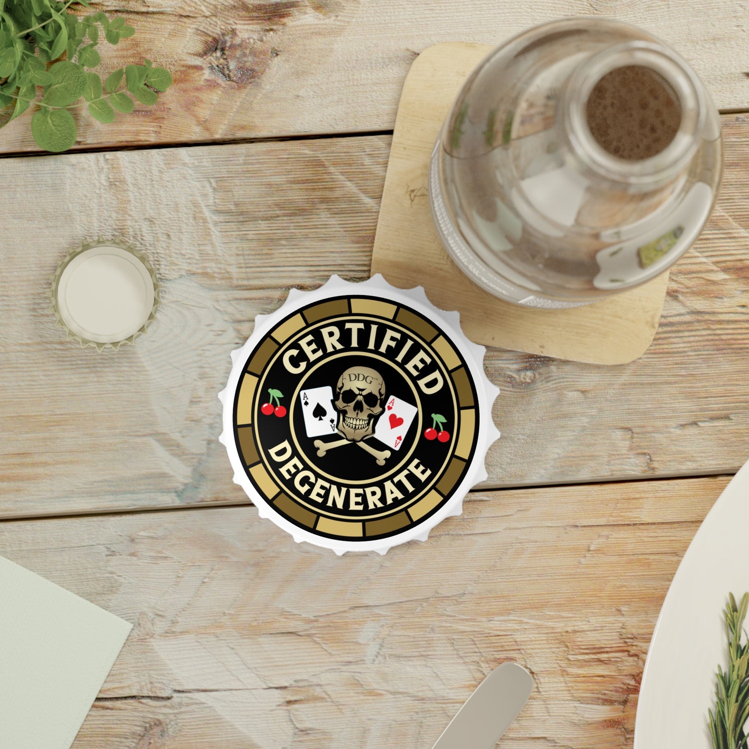 This compact bottle opener brings irreverent energy to late-night poker tables, rowdy bar carts, and basement game nights. The matte polycarbonate top wears a vivid, decal-like magnet that reads “Certified Degenerate,” a wink for gamblers and friends who trade stories over drinks. Flip it and you’ve got two reliable metal-opening mechanisms ready for crown caps. At roughly 3 inches across, it slips into pockets or tucks into a drawer without fuss. It feels solid in hand, cleans up easily, and the bold colors hold up thanks to high-quality print techniques. Keep it near the chips, on a bar tray, or tucked into a gift bundle for friends who love the thrill of the game and the laugh that follows.