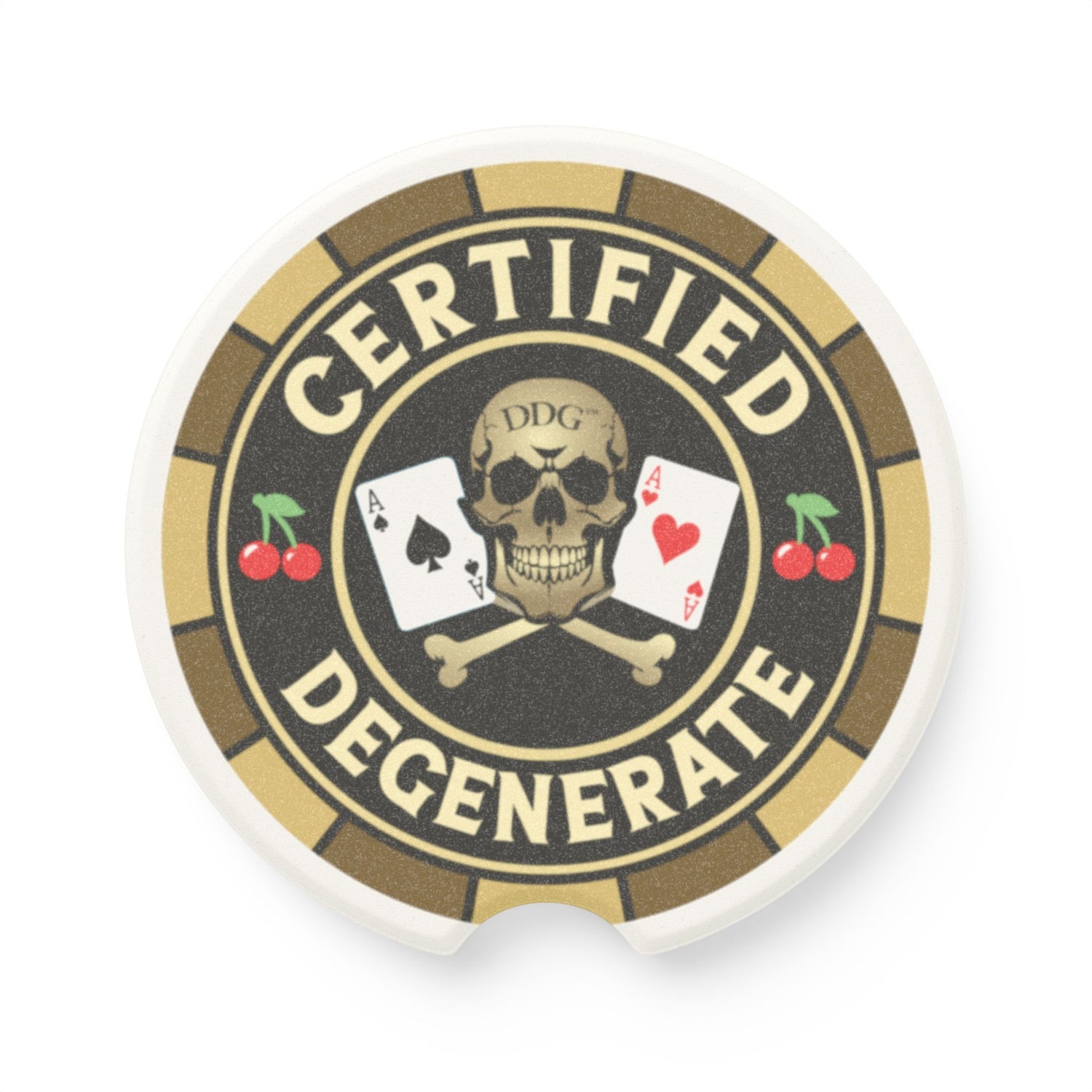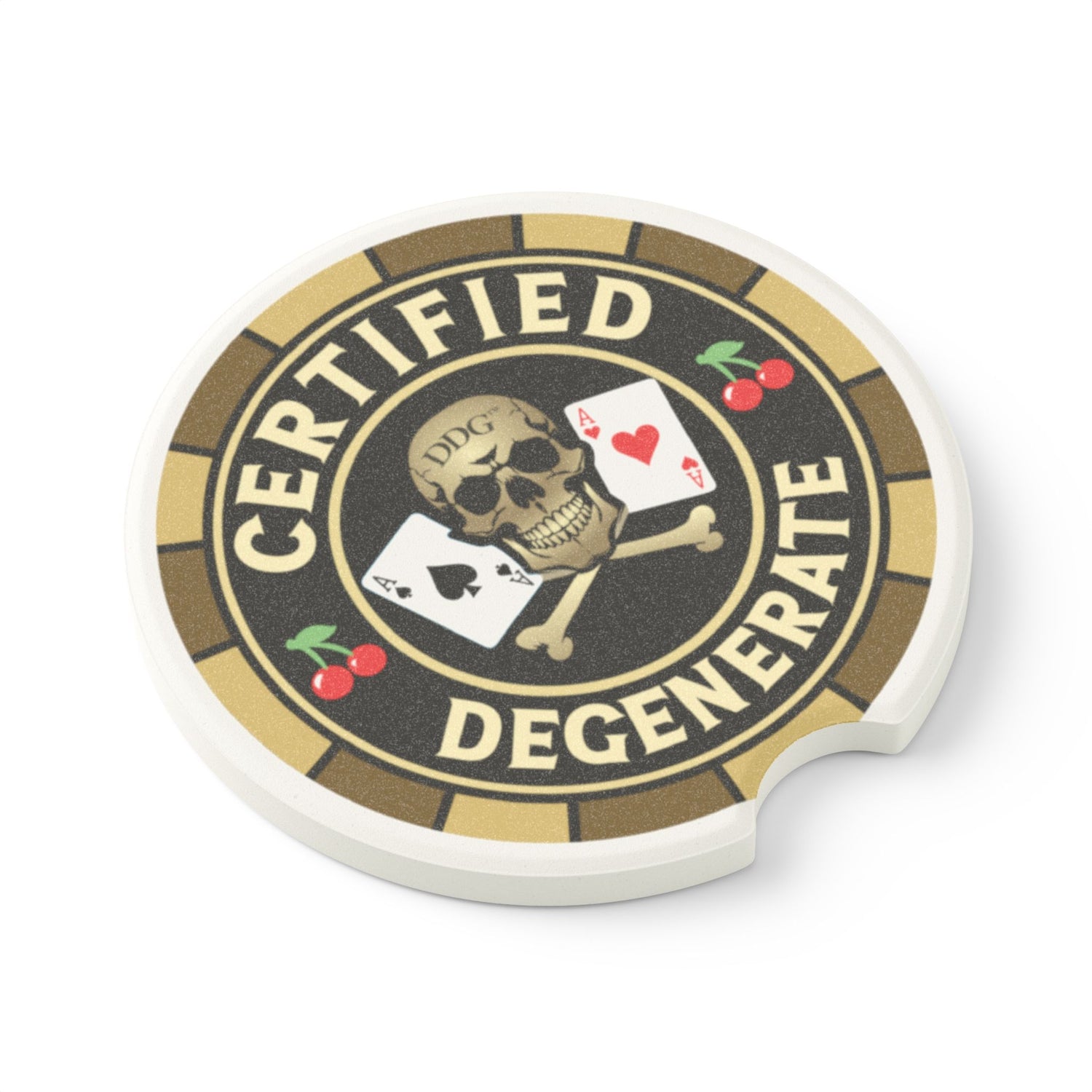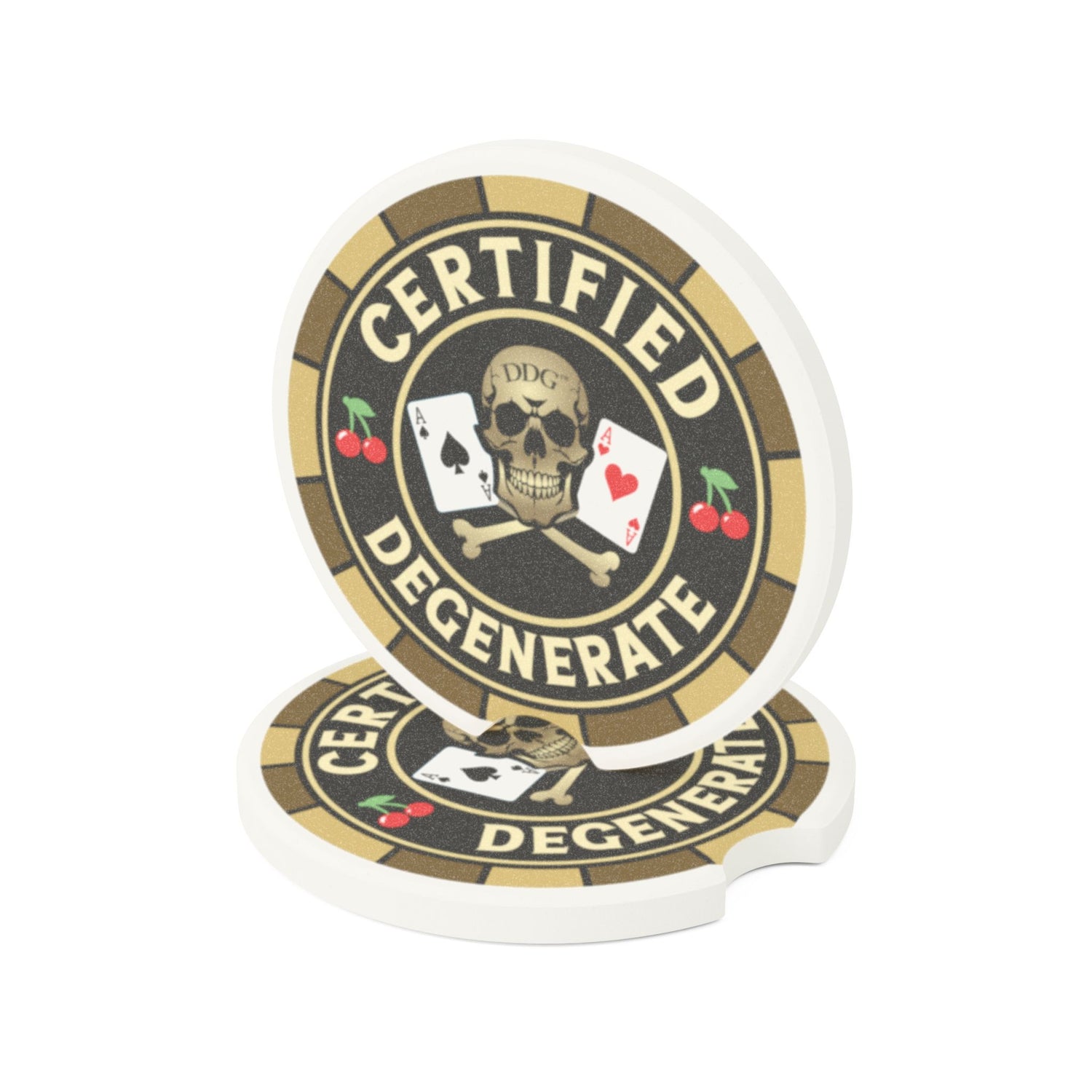 Slide this chunky soapstone coaster into your cup holder and let it do the small, reliable work. The muted matte print reads "Certified Degenerate" with dry humor — a wink for drivers who prefer bad decisions and bold stickers. It soaks up condensation, stops rings and sticky messes, and sits low and steady in most vehicle drink holders. Choose one for yourself or grab a matching set so every passenger has their own. The weighty stone and single-sided matte artwork feel tactile and honest, built for everyday messes and roadside coffee runs.