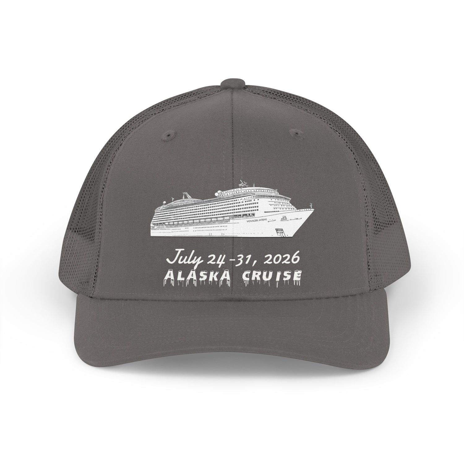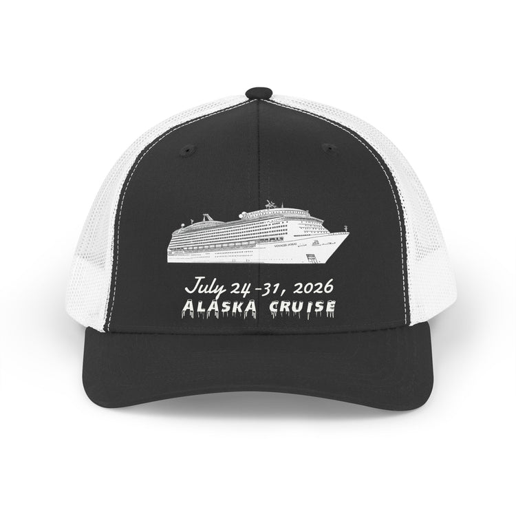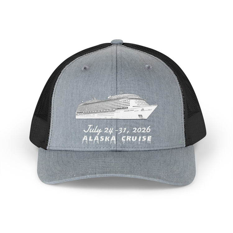 A breezy, retro-inspired trucker hat that carries memories of open decks, salt air, and glacier silhouettes. The front panel features a simple, hand-drawn cruise ship sketch with date and “ALASKA CRUISE” lettering — an understated keepsake for travelers who want a low-key souvenir that still tells a story. Lightweight mesh, a gently curved Permacurv® visor, and a mid-profile six-panel build keep the hat comfortable during sunny shore excursions or strolls along the pier. It sits casually on the head, snaps to size, and ages into something personal after every adventure.